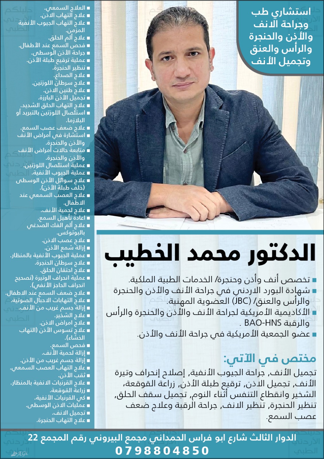 الدكتور محمد الخطيب مختص في كل من : تجميل الأنف , جراحة الجيوب الأنفية , إصلاح إنحراف وتيرة الأنف , تجميل الاذن , ترقيع طبلة الأذن , زراعة القوقعة